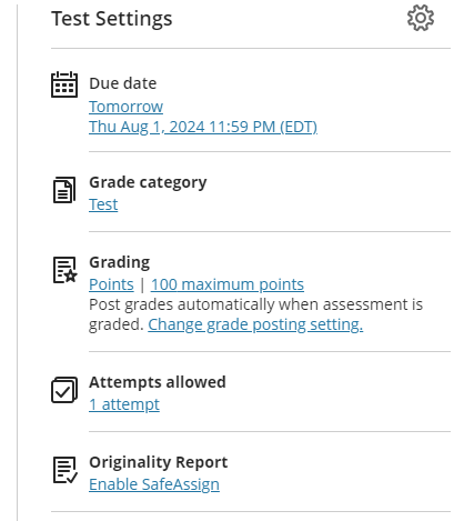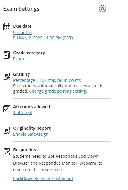 For this example, a final exam was created in the “Content” area. After creating the exam, open the “Test Settings” gear icon (see image below). The image on the below left was automatically created when the content was added. It is important to check this, specifically the due date, the grade category, change the default setting of grading points to percentage, set the attempts allowed (one attempt is the default), enable SafeAssign if needed/desired, and add other test settings as needed. The image on the lower right reflects the changes made and the addition of the Respondus Lockdown Browser, left below.