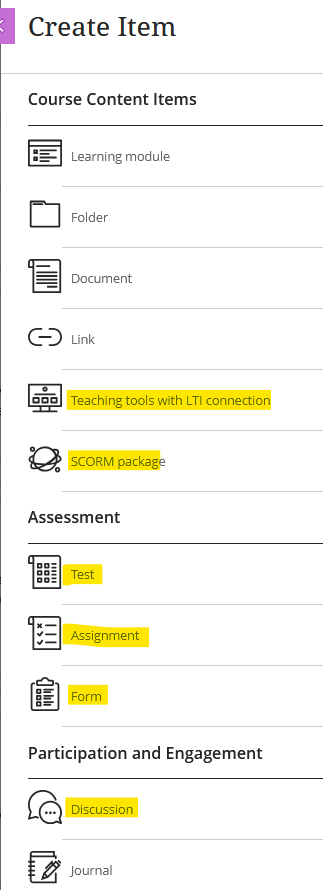 Then select a gradable item, such as an LTI, a test, an assignment, or a discussion forum to create (see image below). A Gradebook category, due date, and grading schema are automatically generated.