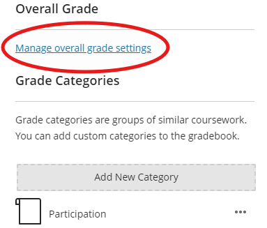 Next, name your category (Participation is being used in this example) and return to the “Manage overall grade settings” option (see image below) to return to the “Calculation Details” screen and set the category weight/percentage.