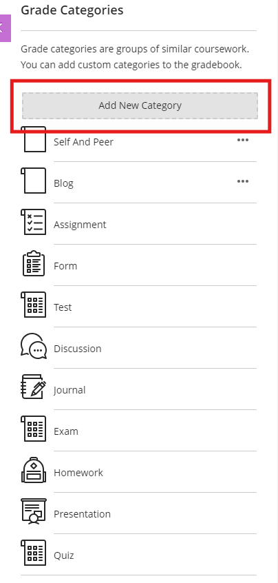 To add a Blackboard Category, click the “Settings” icon on the far right-hand side of the Blackboard Ultra Gradebook screen (see image below).