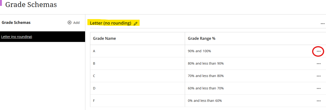 It is important to remove the words in parentheses that read “no rounding” by using the pencil icon beside the phrase (see image below). If you allow rounding in your course, you may adjust the grade range by selecting the three dots beside each row (circled in the image below). NOTE: The grade range should reflect those identified in the college catalog and should not be rounded more than ½ a decimal point (.5). For example: A = 89.5% and 100%, B = 79.5 and less than 89.5, etc. If your program chair or dean deems it is permissible to round grades, the parenthetical phrase “No rounding” still should be removed from the text to allow a successful grade push to Banner.