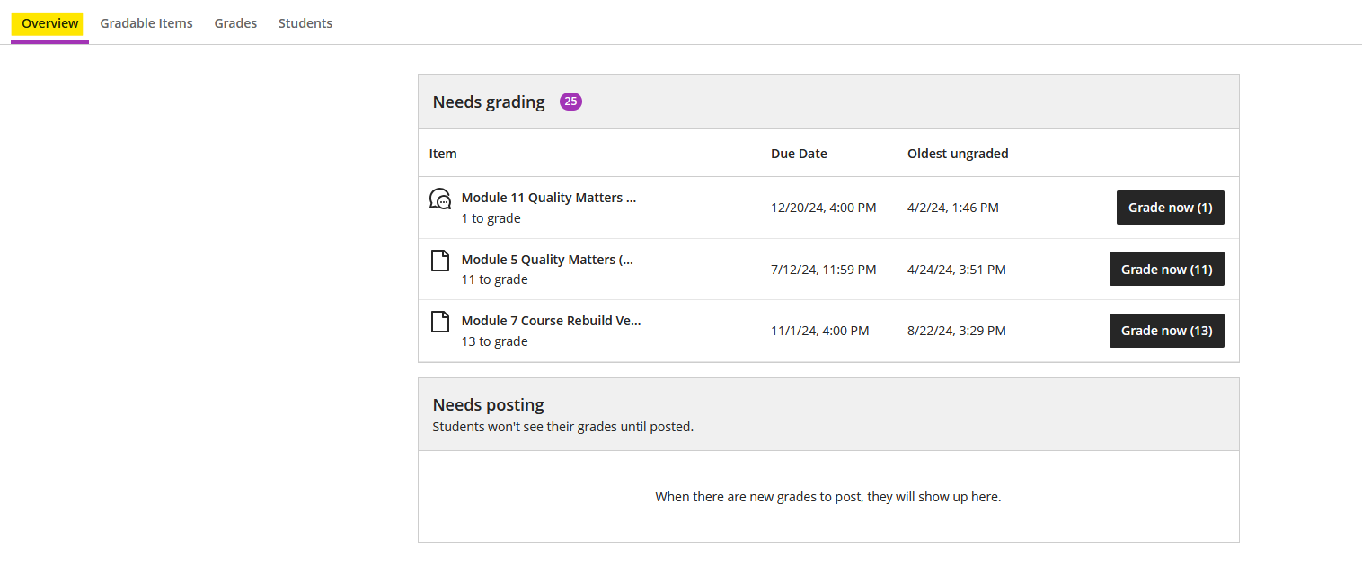 The “Overview” option (see image below) gives a quick overview of any items that need grading within your course.
