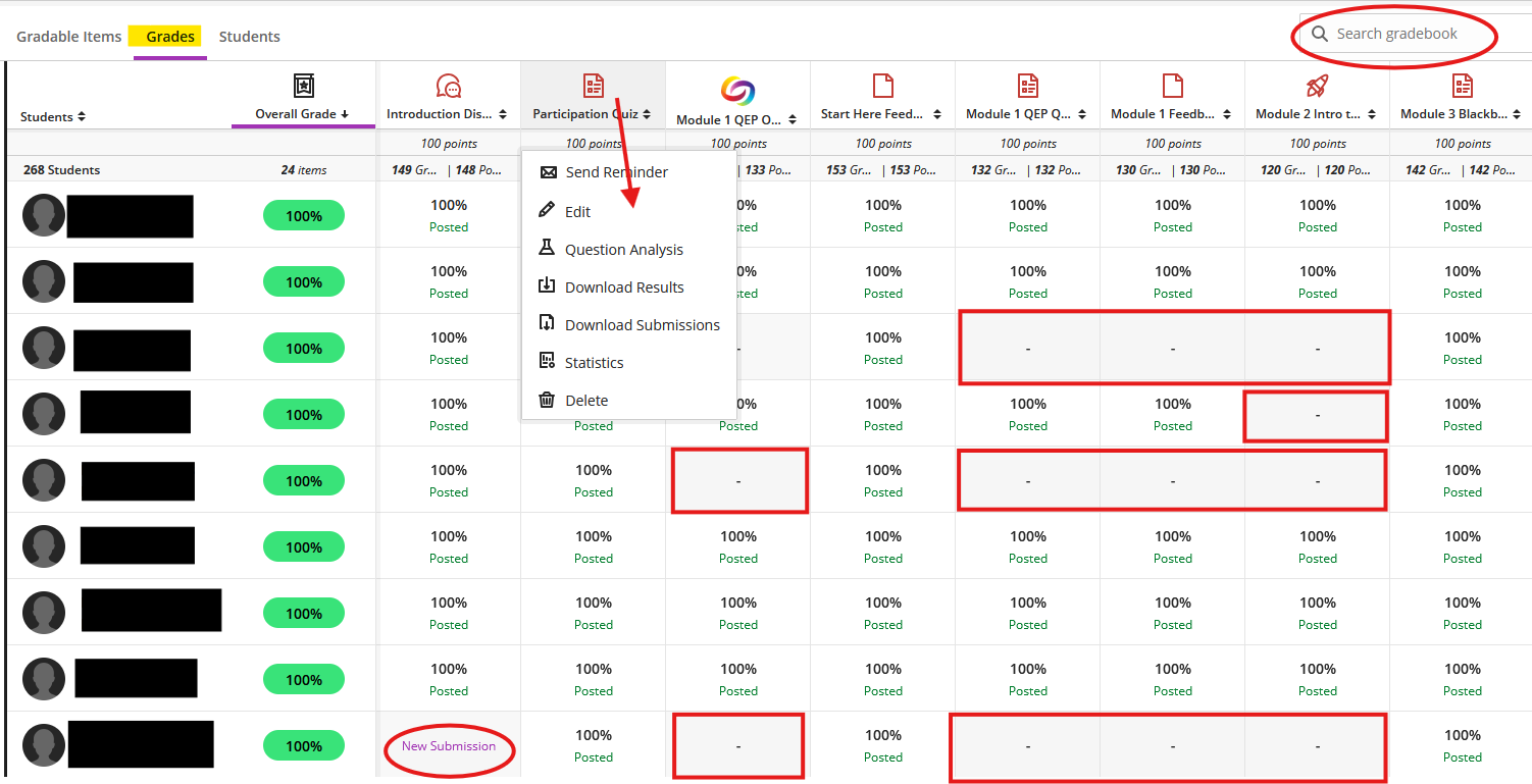 Viewing by “Grades” (see image below) allows instructors to quickly see the overall course grade, any items needing to be posted, and any missing graded items. Items may be quickly sorted using the arrows beside each gradable item, which is extremely helpful for quickly seeing items that require grading or any missing items. Like in the “Gradable Item” view, items may be clicked to select various options. One feature that is extremely helpful in this view is the “Search gradebook” feature, which allows you to search by student name, ID, column name, or category. NOTE: The students' names in this example have been obscured to protect privacy.