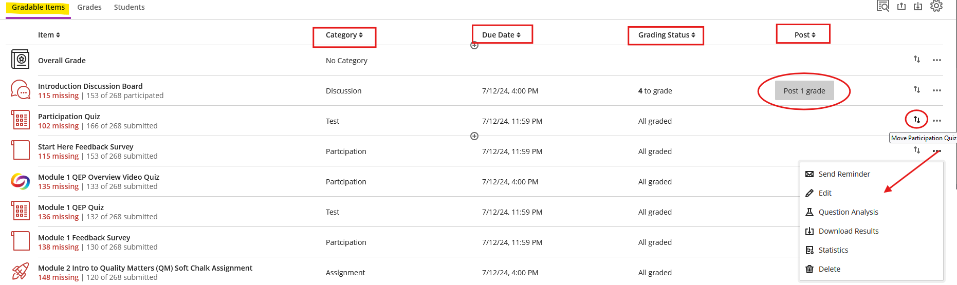 Viewing all “Gradable Items” (see image below) allows instructors to quickly check and ensure all items are assigned to the correct gradable category, view upcoming or past due dates, check the item’s grading status, and determine whether grades need to be posted to the Gradebook. These items may also be sorted by clicking the arrows beside each column. The up/down arrow beside each item in the far-right column allows you to quickly move the item to a new Gradebook location by dragging and dropping the item. The column with three dots in the farthest right-hand column gives several options that are dependent upon the gradable category. Some options include, “Send an email reminder”, “Edit” the item settings, “Question Analysis”, view item “Statistics”, and “Delete” the item (not recommended for live courses as this will also delete any student submissions and grades).