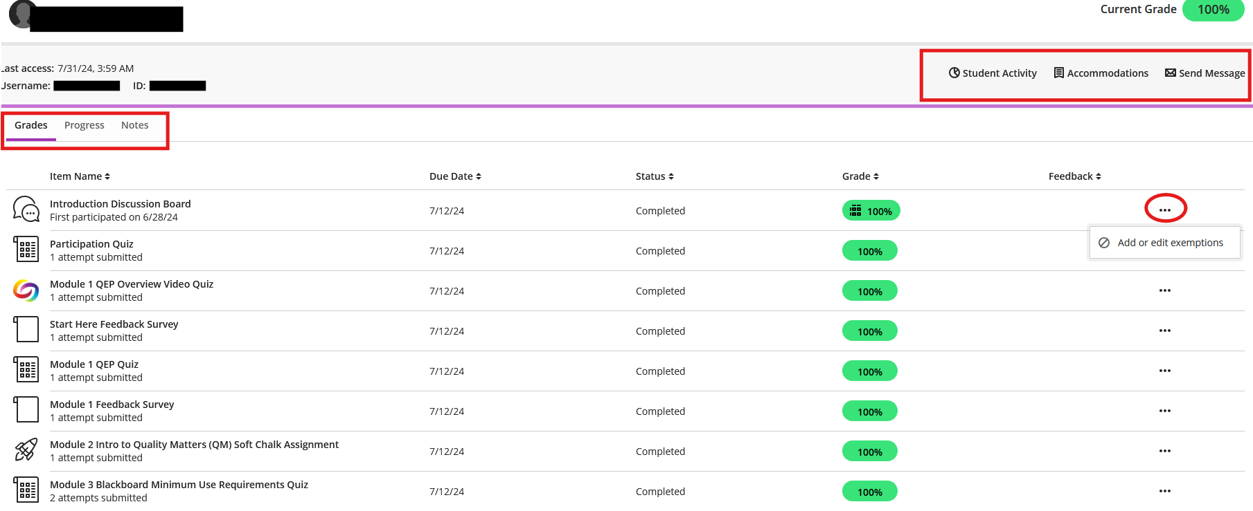 After selecting a student from the “Student” Gradebook view option (shown above), instructors may look at the student’s “Grades” for each item, the student’s course “Progress”, and make any internal “Notes” (see image below). CAUTION: Any notes are subject to Fair Use and Open Records; therefore, instructors should use discretion when making notes on students. The three dots in the far right-hand column allow instructors to add or edit exemptions. The options at the top of the page allow instructors to view a detailed “Student Activity” report, review or set “Accommodations”, such as extended time or extended due date, and “Send a message” directly to the student. NOTE: The student’s name and username/ID in this example have been obscured to protect privacy.