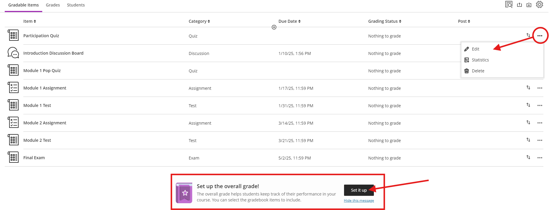 Upon entering the Gradebook, you will see all the gradable content you have added. Each item can be edited by clicking the three dots in the far-right-hand column (see image below). The first time entering the Blackboard Ultra Gradebook, a message to “Set up the overall grade!” is present. The location of this message is determined by the “Gradebook View” being used. In this example, we are in the “Gradable Items” view, and the message is located at the bottom of the Gradebook. Click the “Set it up” message to finalize the Gradebook setup.