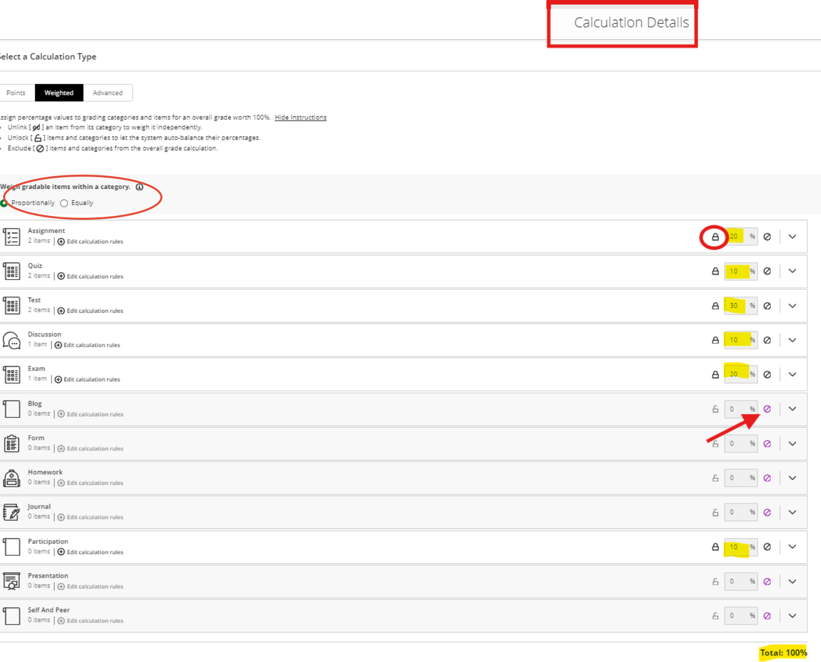 After navigating to the “Next” page (image shown above), read the instructions there to assign percent values to grade categories, aka “Calculation Details”. These values should match what is conveyed in your syllabus and Total 100%. For the example shown below, Tests are worth 30%, Discussion is worth 10%, Assignments are worth 20%, Final Exam (listed as “Exam” here) is worth 20%, Quiz is worth 10%, and Participation is worth 10% (a manual entry, added category). NOTE: Directions for adding a category are included in the next step. It is possible to lock categories using the lock icon (circled in the image below) to avoid categories changing when percent values are changed or new categories are added. If a category isn’t used, select the black interdictory, not allowed circle. After selection, the interdictory, not allowed circle will appear purple to indicate that the category has been removed from the Gradebook (see image below). The gradable items within a category default selection (circled in the image below) is “proportionally”, change this to “equal” by selecting the “Equally” radio button so that items within a category are weighted equally.