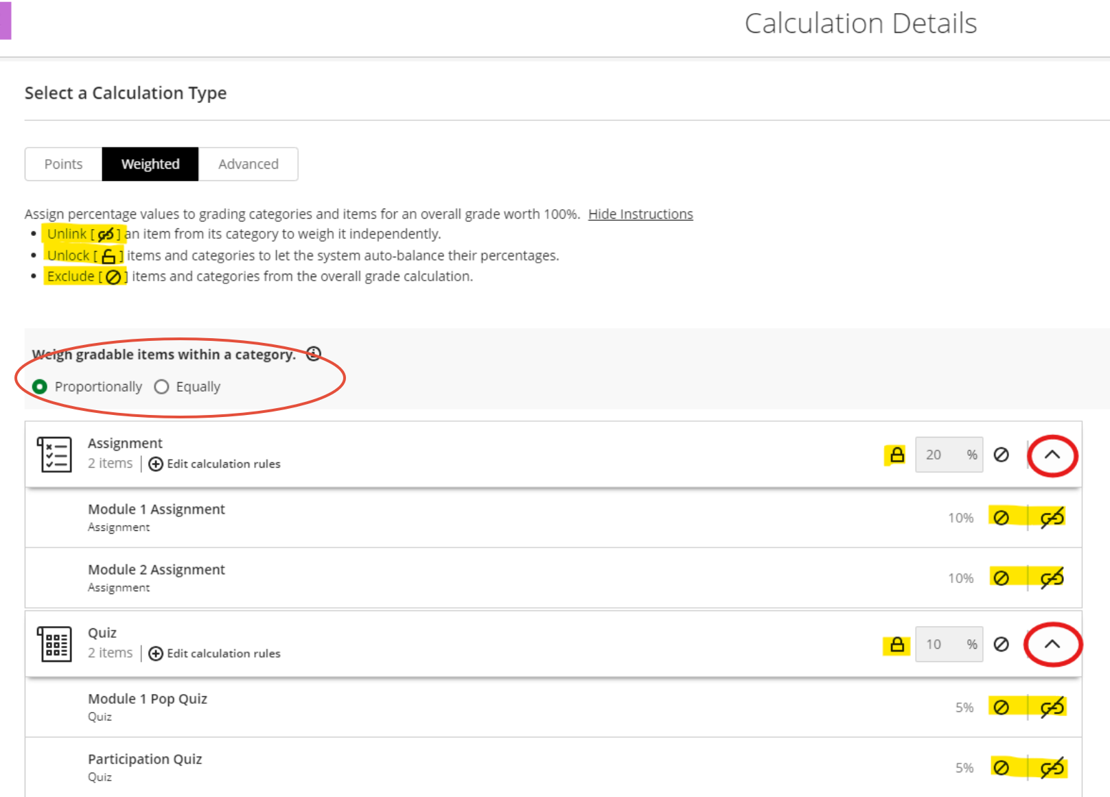 The image below shows an expanded category from the “Calculation Details” page (pictured above). From the expanded view, instructors may exclude a graded item by clicking the black interdictory, not allowed circle, or unlink an item from a category and weigh it separately (see image below). Remember, the gradable items within a category default selection (circled in the image below) is “proportionally”; change this to “equal” by selecting the “Equally” radio button so that items within a category are weighted equally.