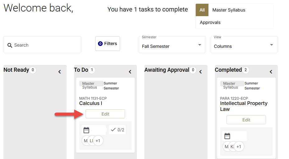 - Once the syllabus is approved and published, it will appear in the Completed column.