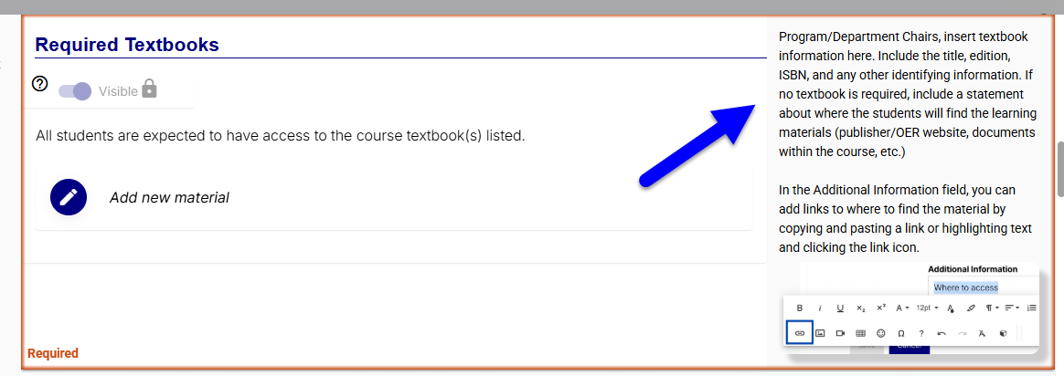 Directions for Editing. When clicking through the sections to edit (#2 above), faculty will see corresponding directions and suggestions on the right side (see image below). This information serves as a guide to understanding the types of information that can be entered in the available field. Some fields will only be displayed for online classes, while others will only be included in the student view if information is entered in the available space. The help text will give the necessary directions.