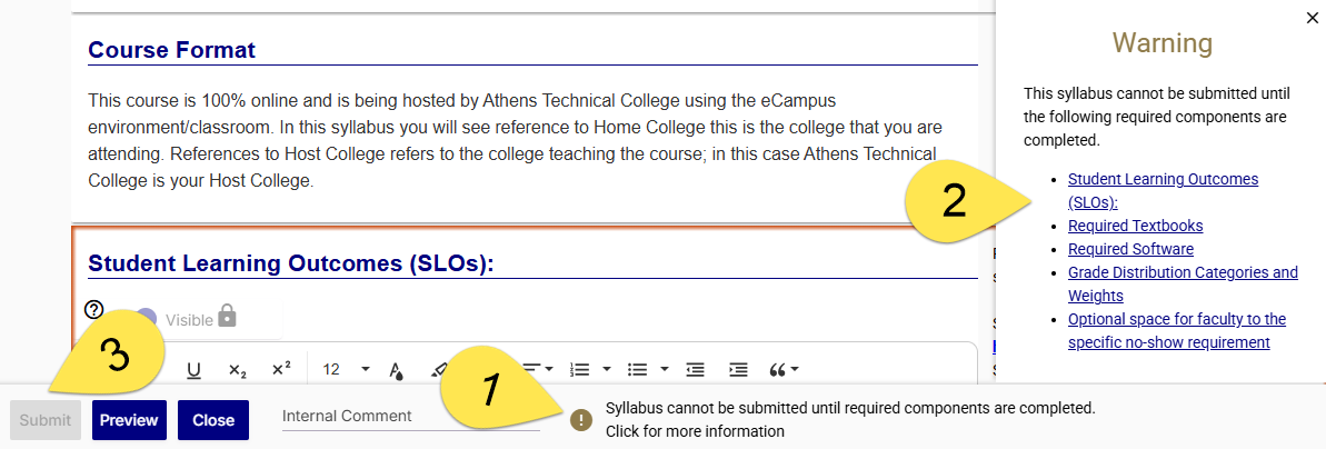3. When all sections have been edited, click the Submit button at the bottom of the page to submit the syllabus for review.